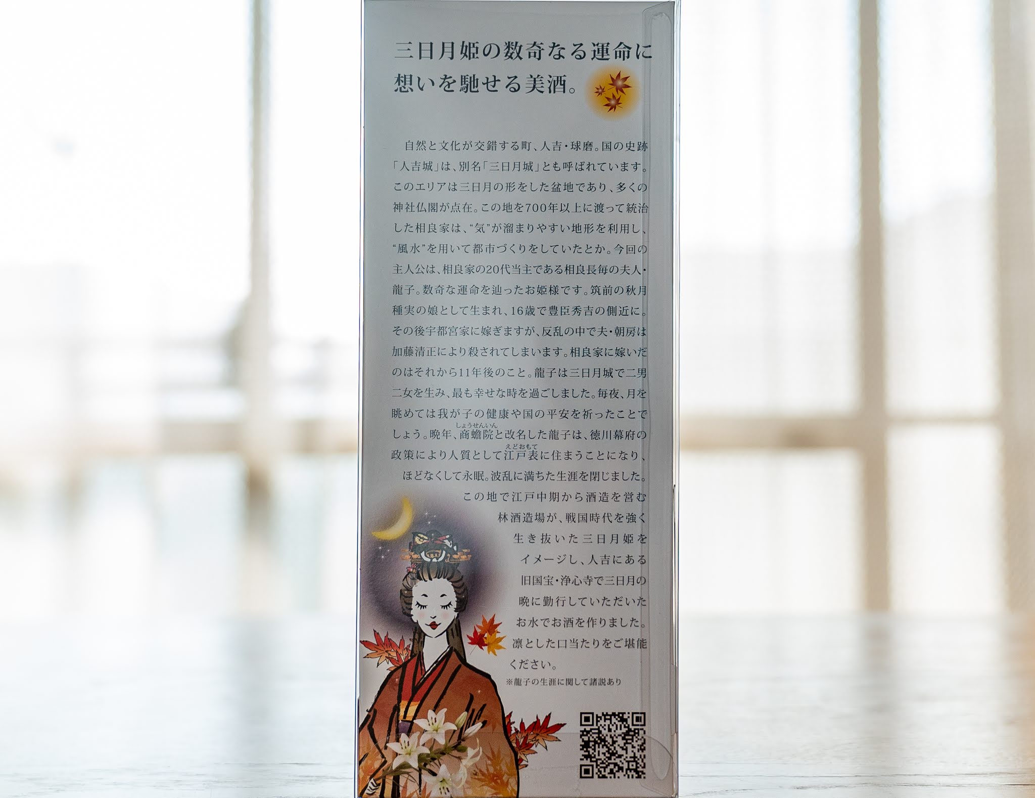 三日月姫に見立てた主人公は、 相良藩13代当主・長毎の夫人、龍子。 数奇な運命を辿ったお姫様です。 筑前・秋月種実の娘として生まれ、 16歳で豊臣秀吉の側近に。 その後宇都宮家に嫁ぎますが、 夫・朝房は反乱の中、 加藤清正に殺されてしまいます。 それから11年後、相良家に嫁ぎ、 三日月城とも呼ばれた人吉城で 二男二女を産み、 龍子にとって最も幸せな時を過ごしました。 晩年、徳川幕府の命により 人質として江戸表に住まうことになり、 ほどなくして永眠。 波乱に満ちた生涯を閉じました。 ※龍子の生涯に関して諸説あり